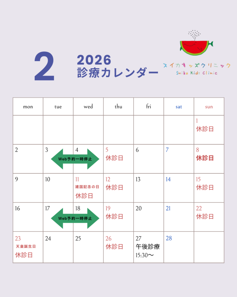 2月27日(金)は、すいかせんせいが美浜区の4か月児健診に出席するため、午後の診療時間が15:30からとなります。
